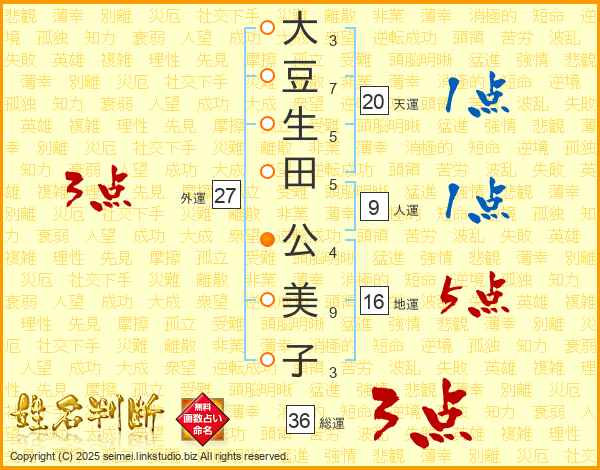 大(3画)豆(7画)生(5画)田(5画) 公(4画)美(9画)子(3画)