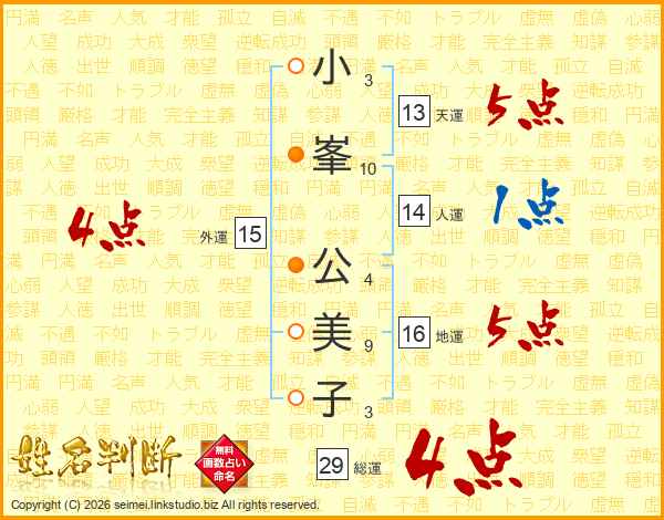 小(3画)峯(10画) 公(4画)美(9画)子(3画)
