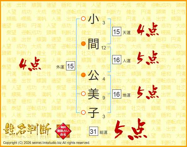 小間公美子さんの総運は31画の5点!