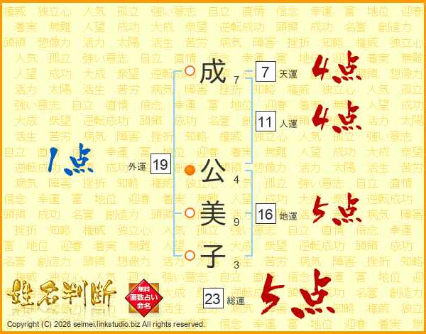 あなたの人生を表す1番重要な運勢です。生涯を通じて影響する総合運となり、主に50歳以降の晩年期に影響を及ぼします。苗字と名前の合計画数。