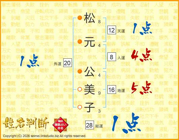 松(8画)元(4画) 公(4画)美(9画)子(3画)