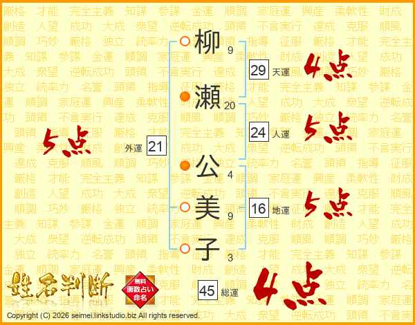 柳(9画)瀬(20画) 公(4画)美(9画)子(3画)