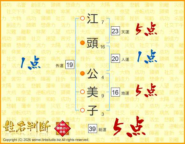 江(7画)頭(16画) 公(4画)美(9画)子(3画)
