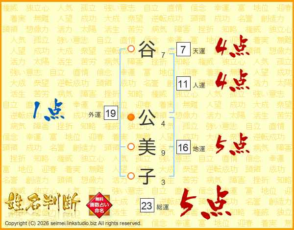 あなたの人生を表す1番重要な運勢です。生涯を通じて影響する総合運となり、主に50歳以降の晩年期に影響を及ぼします。苗字と名前の合計画数。