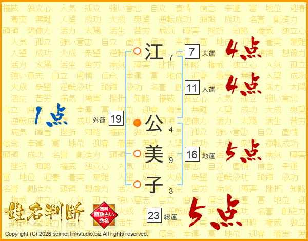 あなたの人生を表す1番重要な運勢です。生涯を通じて影響する総合運となり、主に50歳以降の晩年期に影響を及ぼします。苗字と名前の合計画数。