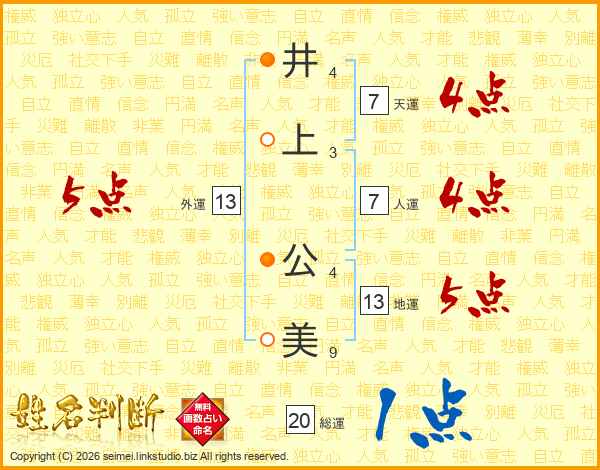 生活面を象徴する運勢です。外部から受ける影響力を表し、結婚運、家庭運や職場、環境への順応性を表します。総運から人運を引いた画数。姓や名が1文字の場合を除く。