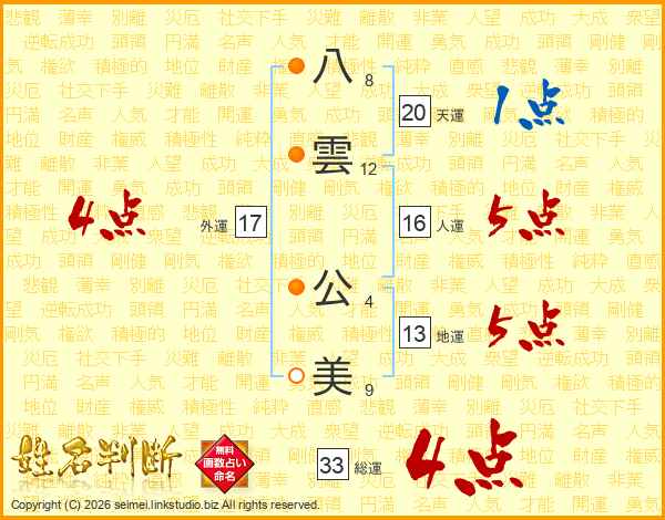 八雲公美さんの総運は33画の4点!
