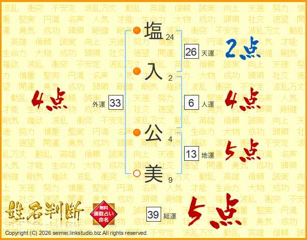 塩(24画)入(2画) 公(4画)美(9画)