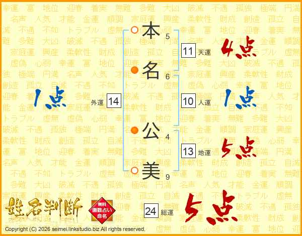 生活面を象徴する運勢です。外部から受ける影響力を表し、結婚運、家庭運や職場、環境への順応性を表します。総運から人運を引いた画数。姓や名が1文字の場合を除く。