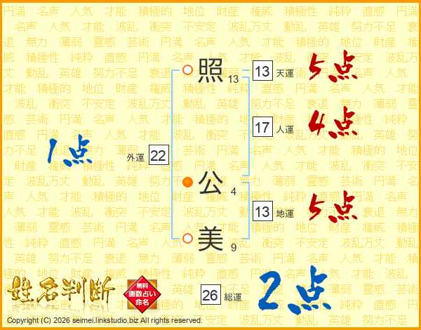 生活面を象徴する運勢です。外部から受ける影響力を表し、結婚運、家庭運や職場、環境への順応性を表します。総運から人運を引いた画数。姓や名が1文字の場合を除く。