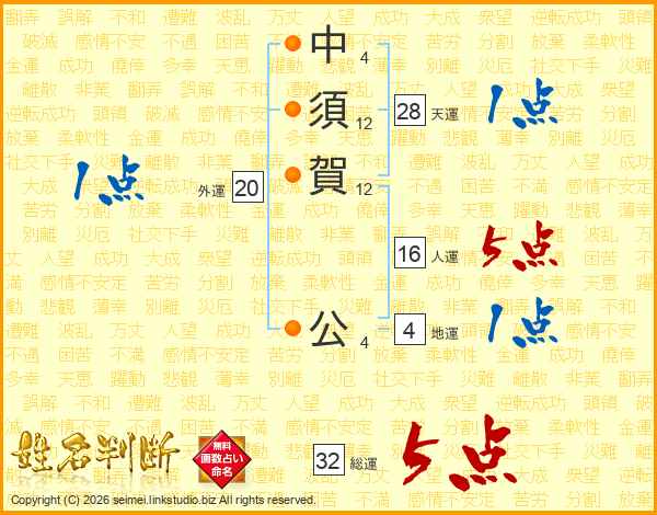 中(4画)須(12画)賀(12画) 公(4画)