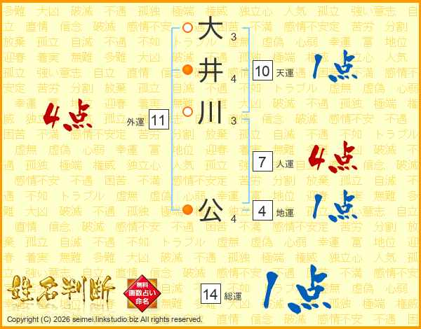生活面を象徴する運勢です。外部から受ける影響力を表し、結婚運、家庭運や職場、環境への順応性を表します。総運から人運を引いた画数。姓や名が1文字の場合を除く。