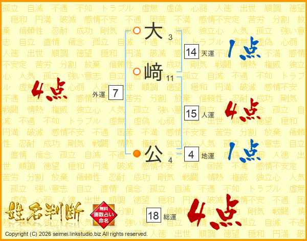 あなたの人生を表す1番重要な運勢です。生涯を通じて影響する総合運となり、主に50歳以降の晩年期に影響を及ぼします。苗字と名前の合計画数。