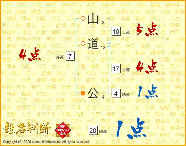 あなたの人生を表す1番重要な運勢です。生涯を通じて影響する総合運となり、主に50歳以降の晩年期に影響を及ぼします。苗字と名前の合計画数。