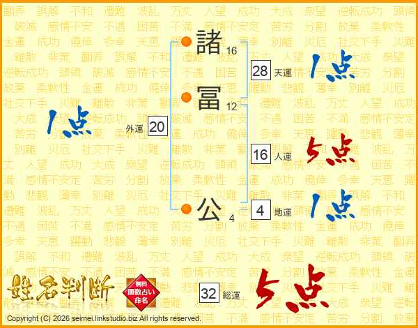 あなたの人生を表す1番重要な運勢です。生涯を通じて影響する総合運となり、主に50歳以降の晩年期に影響を及ぼします。苗字と名前の合計画数。