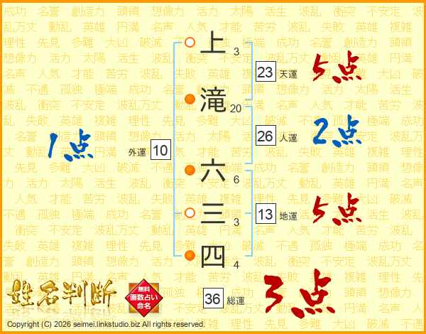 上(3画)滝(20画) 六(6画)三(3画)四(4画)