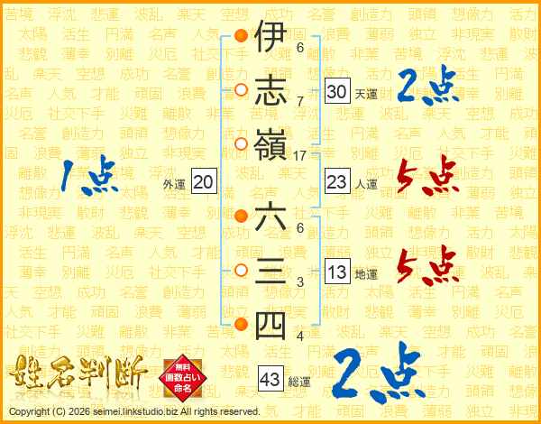 伊(6画)志(7画)嶺(17画) 六(6画)三(3画)四(4画)