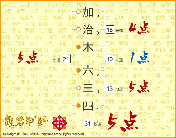 加(5画)治(9画)木(4画) 六(6画)三(3画)四(4画)