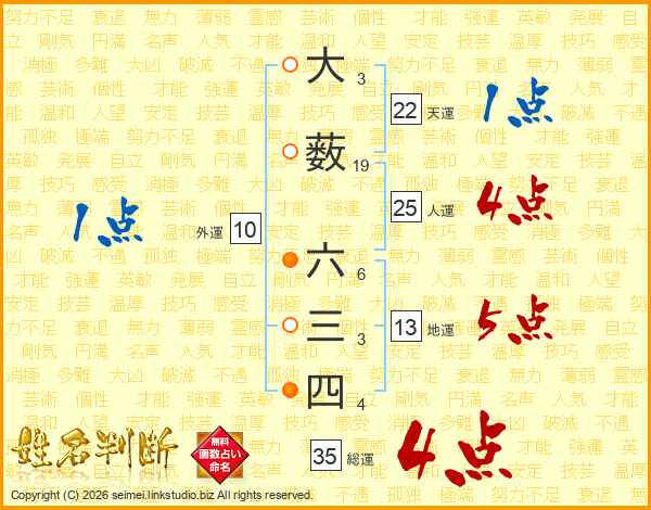 生活面を象徴する運勢です。外部から受ける影響力を表し、結婚運、家庭運や職場、環境への順応性を表します。総運から人運を引いた画数。姓や名が1文字の場合を除く。