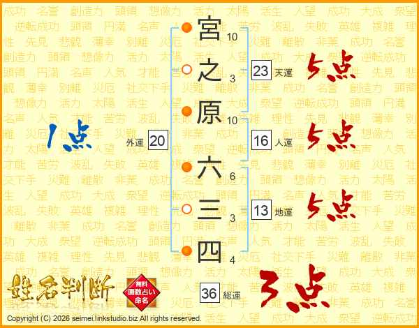 宮(10画)之(3画)原(10画) 六(6画)三(3画)四(4画)