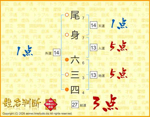 生活面を象徴する運勢です。外部から受ける影響力を表し、結婚運、家庭運や職場、環境への順応性を表します。総運から人運を引いた画数。姓や名が1文字の場合を除く。