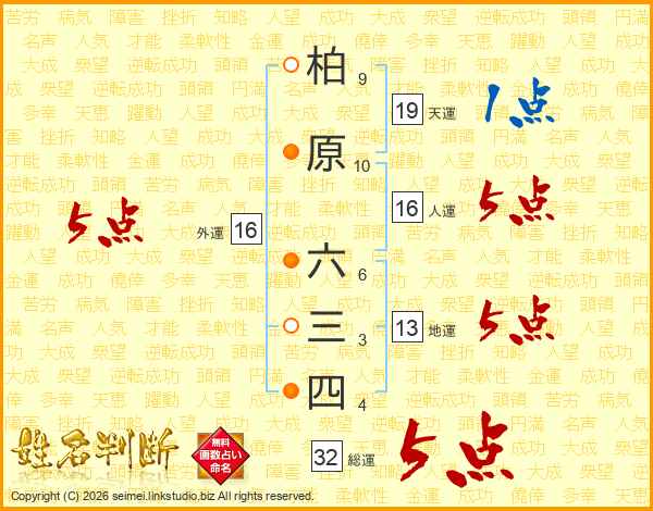 柏原六三四さんの総運は32画の5点!
