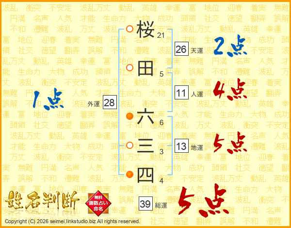 桜(21画)田(5画) 六(6画)三(3画)四(4画)