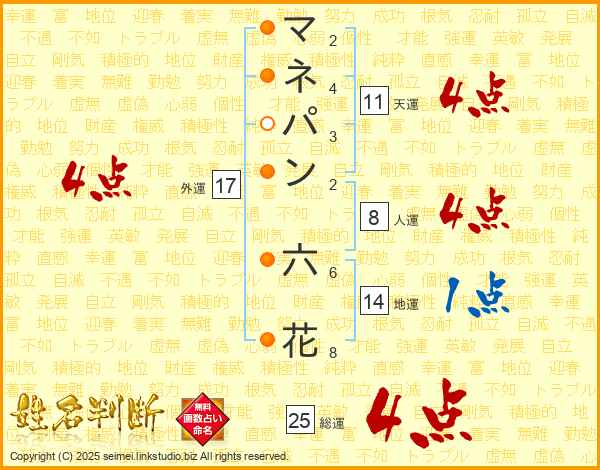 生活面を象徴する運勢です。外部から受ける影響力を表し、結婚運、家庭運や職場、環境への順応性を表します。総運から人運を引いた画数。姓や名が1文字の場合を除く。