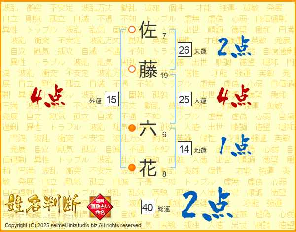 生活面を象徴する運勢です。外部から受ける影響力を表し、結婚運、家庭運や職場、環境への順応性を表します。総運から人運を引いた画数。姓や名が1文字の場合を除く。