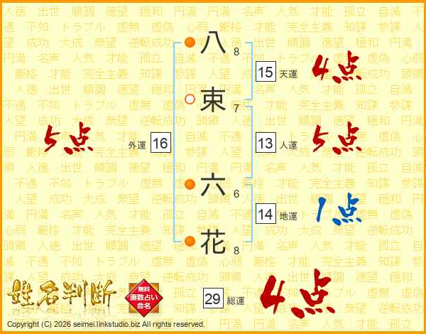 生活面を象徴する運勢です。外部から受ける影響力を表し、結婚運、家庭運や職場、環境への順応性を表します。総運から人運を引いた画数。姓や名が1文字の場合を除く。