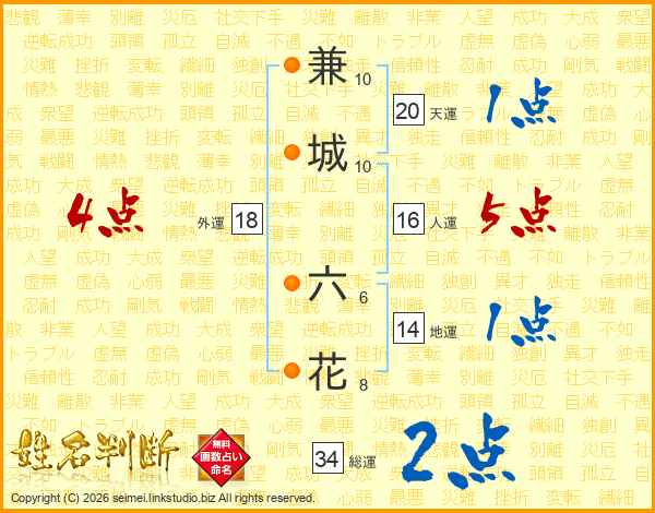 生活面を象徴する運勢です。外部から受ける影響力を表し、結婚運、家庭運や職場、環境への順応性を表します。総運から人運を引いた画数。姓や名が1文字の場合を除く。