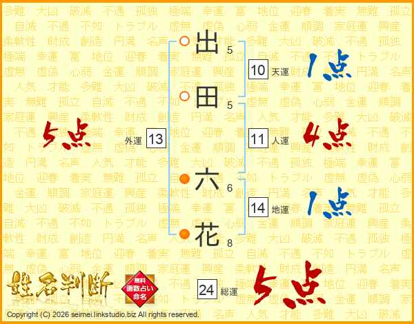 生活面を象徴する運勢です。外部から受ける影響力を表し、結婚運、家庭運や職場、環境への順応性を表します。総運から人運を引いた画数。姓や名が1文字の場合を除く。