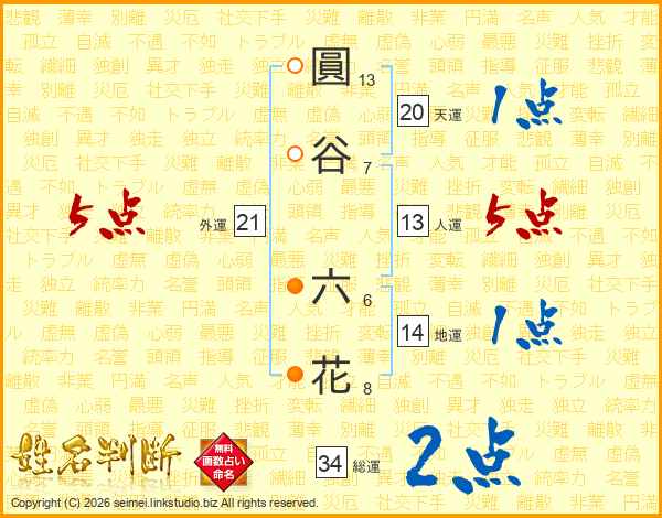 生活面を象徴する運勢です。外部から受ける影響力を表し、結婚運、家庭運や職場、環境への順応性を表します。総運から人運を引いた画数。姓や名が1文字の場合を除く。