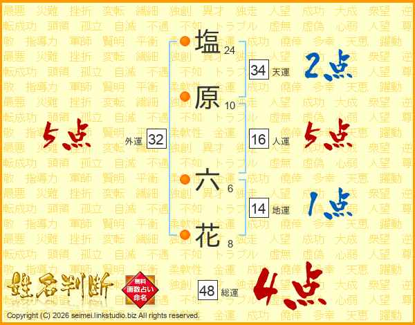 塩(24画)原(10画) 六(6画)花(8画)
