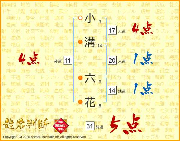 生活面を象徴する運勢です。外部から受ける影響力を表し、結婚運、家庭運や職場、環境への順応性を表します。総運から人運を引いた画数。姓や名が1文字の場合を除く。