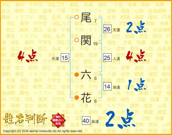生活面を象徴する運勢です。外部から受ける影響力を表し、結婚運、家庭運や職場、環境への順応性を表します。総運から人運を引いた画数。姓や名が1文字の場合を除く。