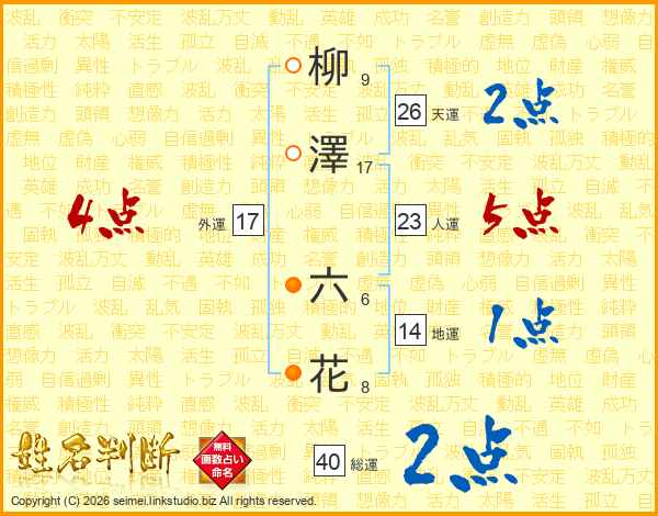柳(9画)澤(17画) 六(6画)花(8画)