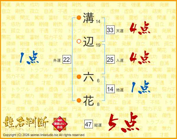 生活面を象徴する運勢です。外部から受ける影響力を表し、結婚運、家庭運や職場、環境への順応性を表します。総運から人運を引いた画数。姓や名が1文字の場合を除く。