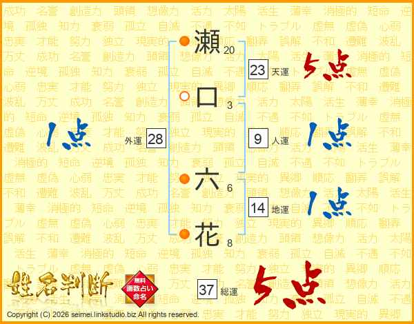 生活面を象徴する運勢です。外部から受ける影響力を表し、結婚運、家庭運や職場、環境への順応性を表します。総運から人運を引いた画数。姓や名が1文字の場合を除く。