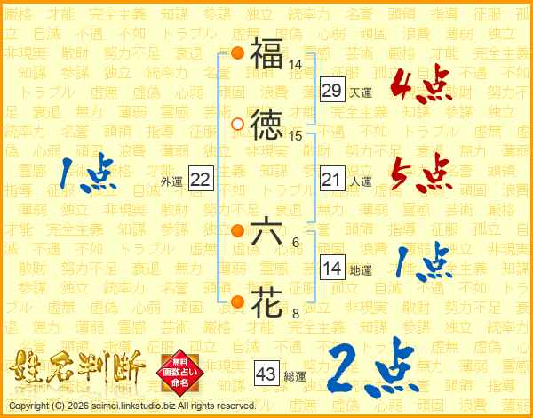福(14画)徳(15画) 六(6画)花(8画)