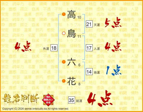 生活面を象徴する運勢です。外部から受ける影響力を表し、結婚運、家庭運や職場、環境への順応性を表します。総運から人運を引いた画数。姓や名が1文字の場合を除く。