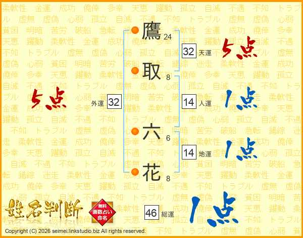生活面を象徴する運勢です。外部から受ける影響力を表し、結婚運、家庭運や職場、環境への順応性を表します。総運から人運を引いた画数。姓や名が1文字の場合を除く。