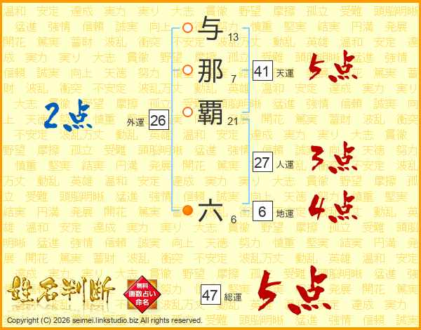 生活面を象徴する運勢です。外部から受ける影響力を表し、結婚運、家庭運や職場、環境への順応性を表します。総運から人運を引いた画数。姓や名が1文字の場合を除く。