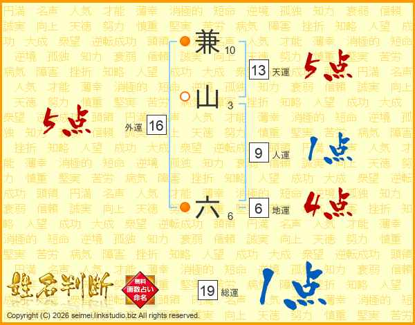 あなたの人生を表す1番重要な運勢です。生涯を通じて影響する総合運となり、主に50歳以降の晩年期に影響を及ぼします。苗字と名前の合計画数。