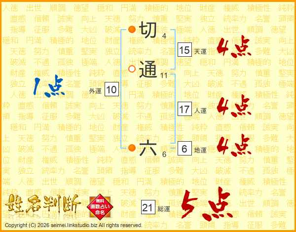 切通六さんの総運は21画の5点!