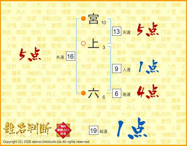生活面を象徴する運勢です。外部から受ける影響力を表し、結婚運、家庭運や職場、環境への順応性を表します。総運から人運を引いた画数。姓や名が1文字の場合を除く。