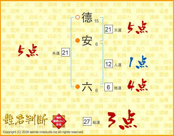生活面を象徴する運勢です。外部から受ける影響力を表し、結婚運、家庭運や職場、環境への順応性を表します。総運から人運を引いた画数。姓や名が1文字の場合を除く。
