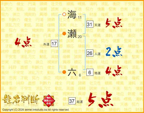 海瀬六さんの人運は26画の2点!