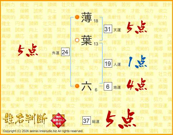 薄葉六さんの総運は37画の5点!