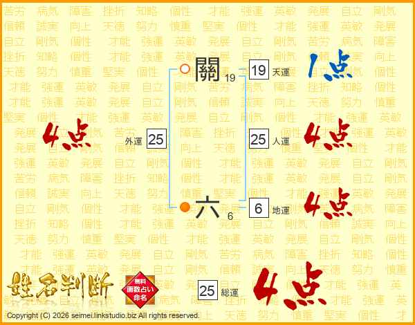生活面を象徴する運勢です。外部から受ける影響力を表し、結婚運、家庭運や職場、環境への順応性を表します。総運から人運を引いた画数。姓や名が1文字の場合を除く。